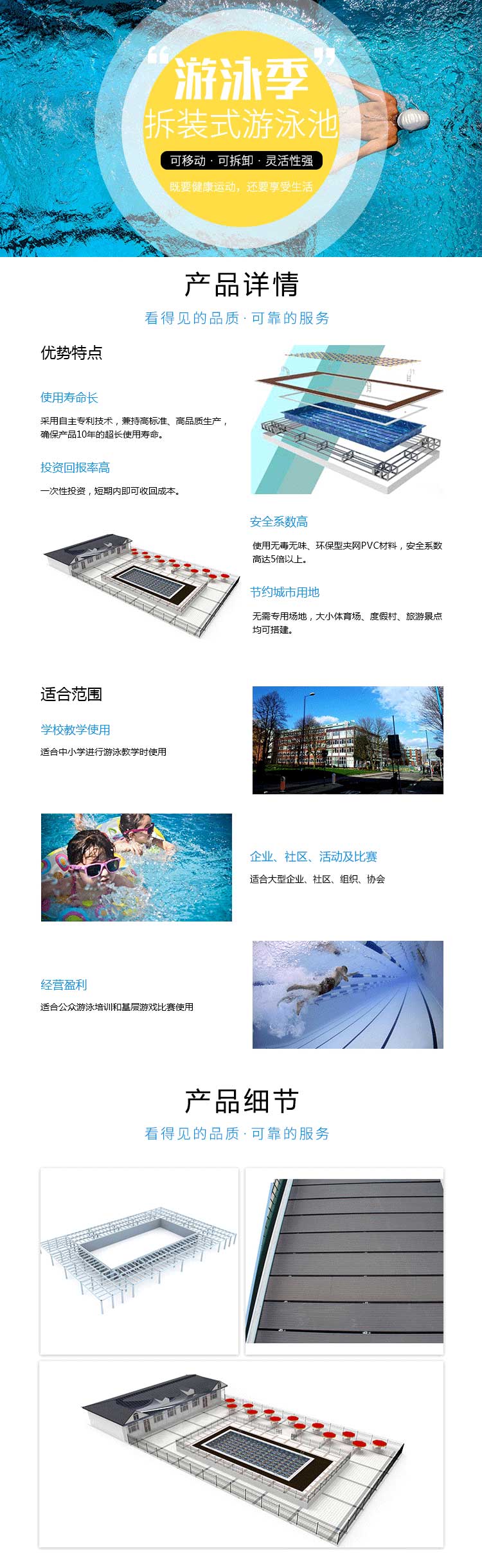 本公司對拆裝式泳池進(jìn)行研發(fā)制造,至今已積累豐富經(jīng)驗,掌握和攻克了大量的技術(shù)難關(guān),現(xiàn)在公司產(chǎn)品的構(gòu)造、工藝已達(dá)到了國內(nèi)外先進(jìn)水平。并以產(chǎn)品安全可靠的品質(zhì)、溫馨優(yōu)質(zhì)的售后、全面貼心的配套服務(wù)獲得客戶的一致好評。